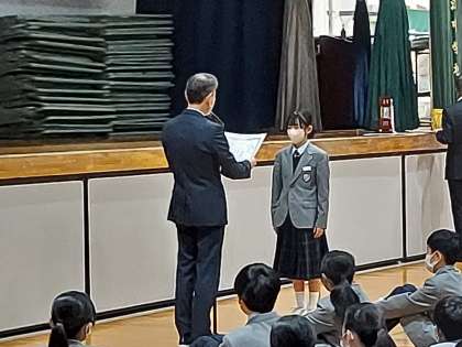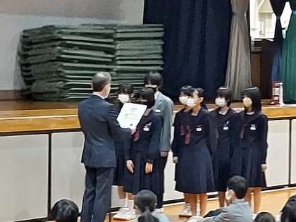 国語科で取り組んだ読書感想文、吹奏楽部のアンサンブルコンテスト金賞、男子バスケ部のブロック新人戦優勝の賞状伝達を行いました。