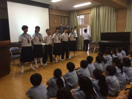 今日は堀江小学校に出向いて、生徒会役員による「情報モラル教育出前授業」を行いました。昨日の出前授業をもとに再びバージョンアップして臨みました。初めのコントは,練習の成果がかなりあったようです。(よかった!)小学生の皆さんも真剣に受けていただきありがとうございました。