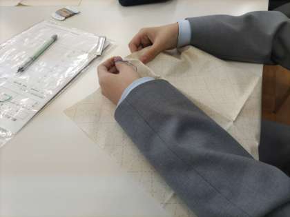 1年生の家庭科授業の様子です。「刺し子」でランチョンマットを作っているところです。完成が楽しみです。