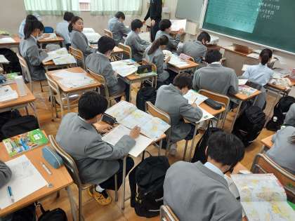 1年生の社会では、赤道や子午線などを地図帳で調べて、ワークシートに色づけをして、位置関係を学んでいました。