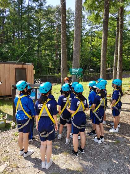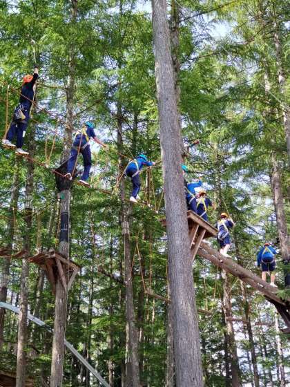 チームビルディング後は、ヘルメットとハーネスを着用し、高さ8mの木の上をツリートレッキング。子どもたちは、こわごわながらも楽しんでいました。