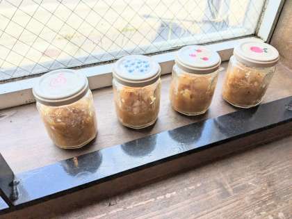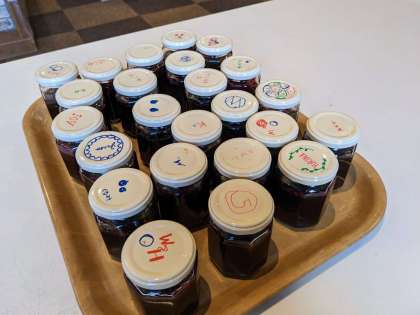 ジャムが完成し、瓶詰めをしました。瓶のふたは、思い思いにデコレーションしました。