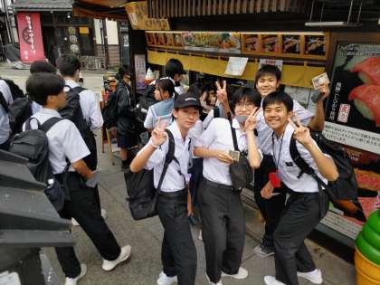 笑顔あふれる高山散策。修学旅行の大きな思い出の1つになることでしょう。