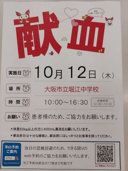 明後日の10月12日(木)の午前10時から午後4時30分の間、本校体育館棟付近で行いますので、お時間ございましたら、献血のご協力をお願いします。