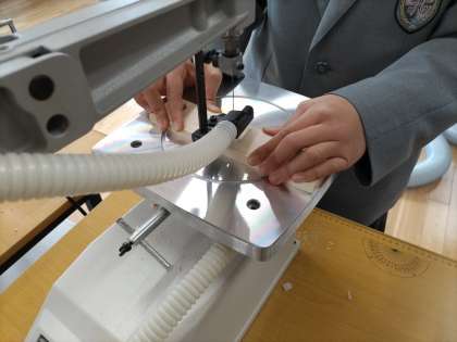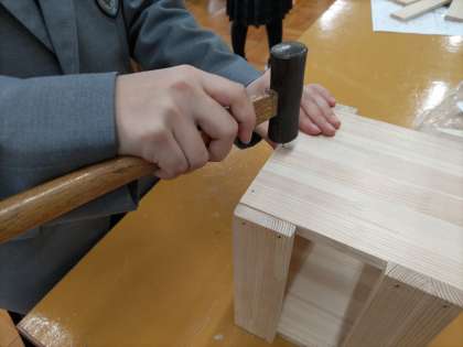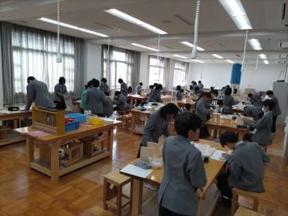 1年生の技術の授業風景です。木材加工として、本立てを製作しているようすです。