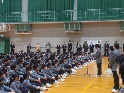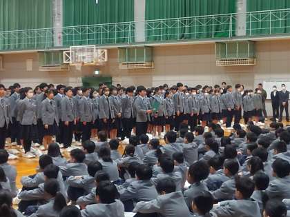 3日に入学式をむかえた新入生と、2・3年生全員がはじめて集まる機会となりましたので、対面式が行われました。「歓迎のことば」と「新入生のことば」の様子です。