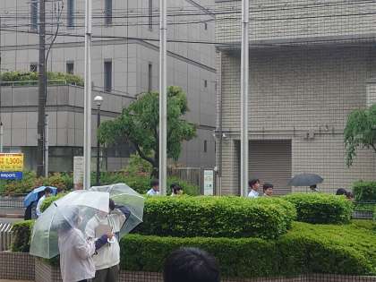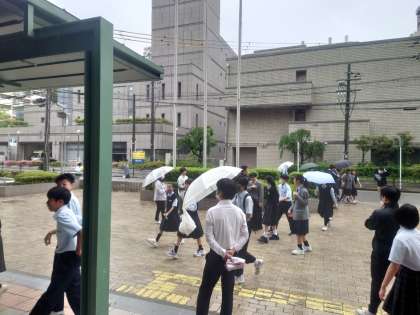 傘をさして登校する生徒とともに、公園や校舎周辺のゴミ拾いのボランティアを終えた吹奏楽部の部員たちが戻ってきています。