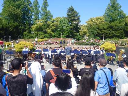 本日西区の靭公園でバラ園コンサートが行われました。朝から様々な団体が歌やダンスを披露する中、大トリは堀江中学校の吹奏楽部です。