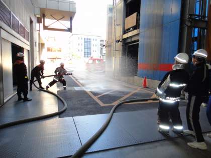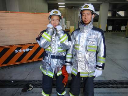 *消防署では実際に消防服を身にまとい、消火練習をしました。