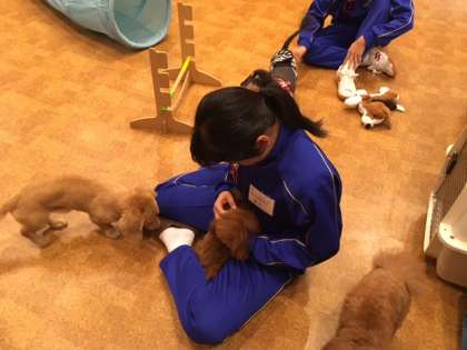 *動物病院では動物を預かり、預かった動物たちと遊ぶ体験をしたり、掃除をしたりしています。