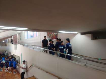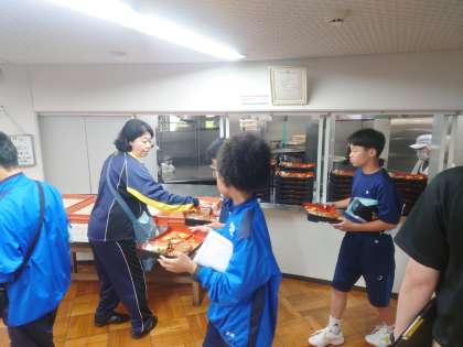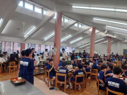入浴と夕食の時間です。4クラスずつ入れ替わりで対応します。前半は1組から4組が先に食事をとります。「いただきます!」