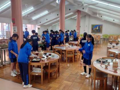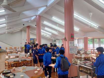 写真は、食事係が準備してくれている様子と「いただきます」の様子です。