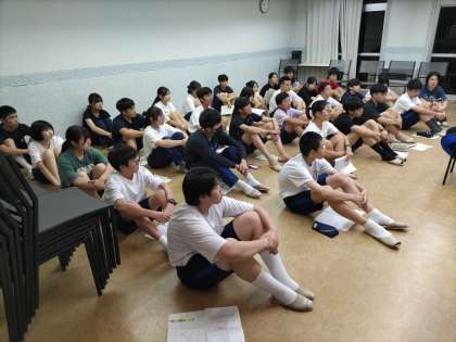 本日の活動が終わり、班長が集まってのミーティングを行いました。本日の振り返りと、明日の行動予定を確認しました。