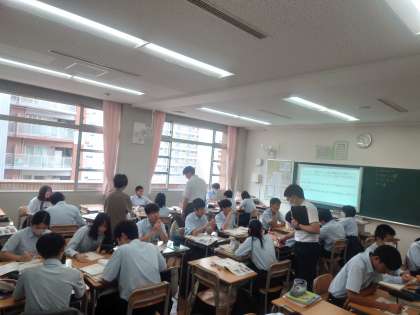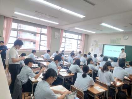 本日堀江中学校では、研究授業が行われています。先生や教育センターから来られたスクールアドバイザーの先生が授業見学を行い、その後、校内研修会として、授業者と見学者で課題や良かった点などを出し合い、協議をします。双方にとって大変有益な取り組みとなっています。
