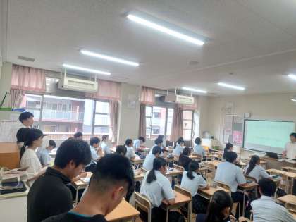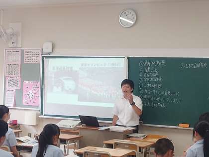 続いて行われた、3限目の社会の授業の様子です。大変多くの先生方が見学に来ています。そんな中ですが、生徒たちも積極的に発言し、活発な授業となっています。