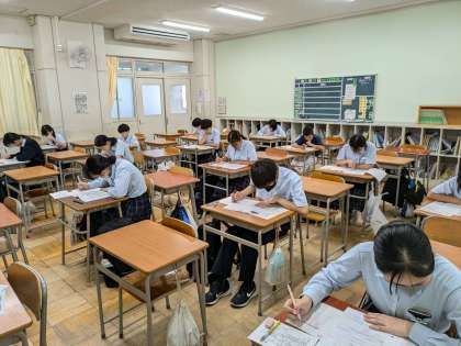 写真は、一生懸命テストに取り組んでいる生徒たちの様子です。