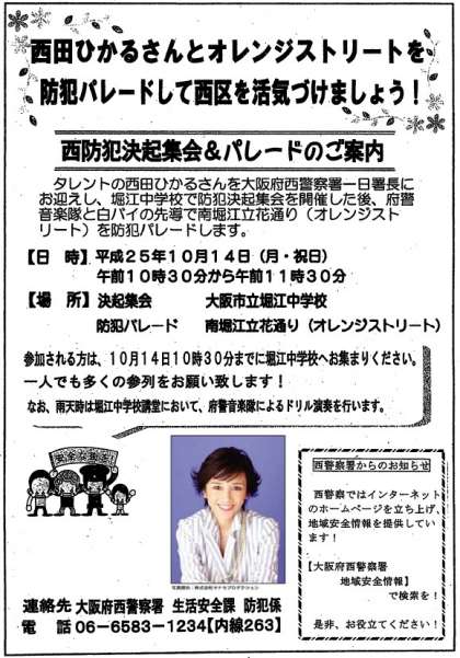 先日、生徒には配布しておりますが、今度の月曜日に本校グランドにて、西区防犯決起集会&パレードが行われます。