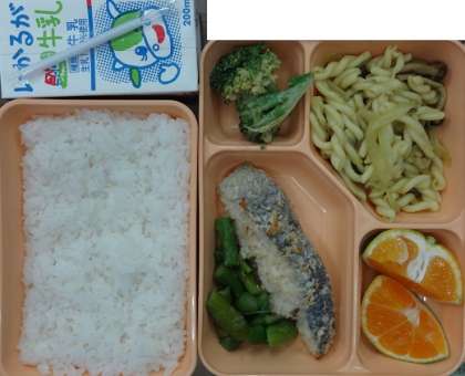 今日の給食の献立は、白身魚のチーズパン粉焼き、ボイルアスパラガス、マカロニソテー、ブロッコリーのごまソースがけ、みかん でした。