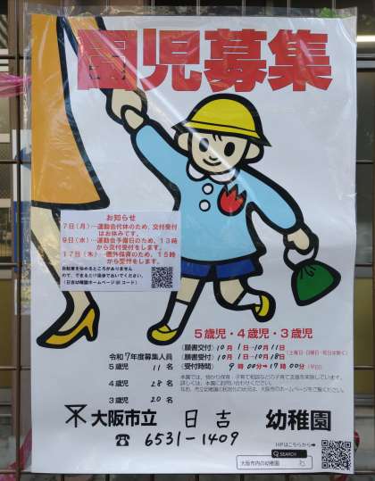 大阪市立日吉幼稚園の園児募集が始まります。本校、校舎北側に募集ポスターを掲示しています。募集に関して相談がありましたら、日吉幼稚園までご連絡願います。(06-6531-1409)