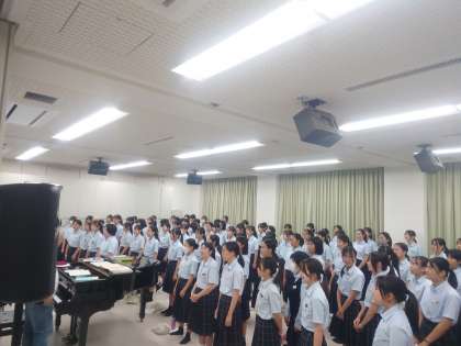 写真は、音楽室での全体合唱の練習と、劇の練習の様子です。