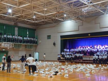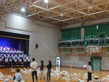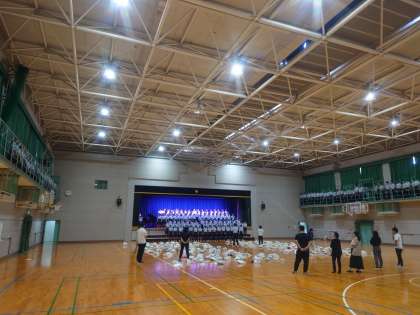 各学級の合唱練習に加えて、文化発表会の全体合唱、紙すきや劇などの取組というハードなスケジュールとなっていますが、さすが3年生です。体育館には、迫力のある素晴らしい歌声が広がっています。