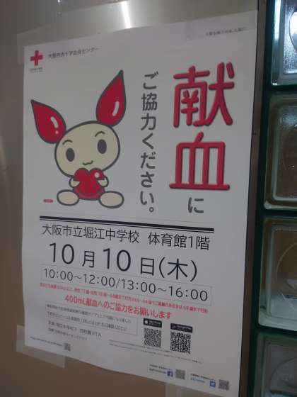 10月10日(木)、本校体育館棟1階武道場が献血会場となります。ご協力お願いいたします。