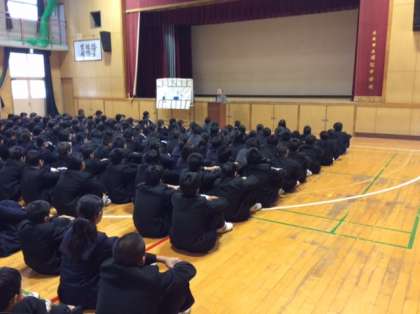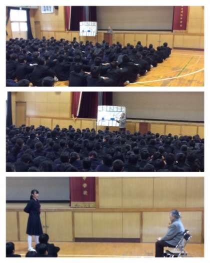 12月9日午後から、全校生徒とPTA実行委員の方々と体育館で「平和学習」の一環として大阪戦災傷害者・遺族の会の伊賀孝子さんに学校まで来ていただき、大阪大空襲の様子を中心にお話を聞かせていただきました。84歳の伊賀さんは、生まれた年が満州事変の年で、中学の2年生までずっと戦争状態だったこと、戦争中で修学旅行もなくなり、暖房もなくなるなどの生活だんだんと苦しくなっていったこと。そして、昭和20年3月13日夜から14日未明にかけての大阪大空襲の様子を語ってくれました。ご自身も大やけどを負うとともにご家族を亡くされた話や逃げ惑う人々の様子もお話をしていただきました。そして、戦争は負けた国だけでなく勝った国の人々にも悲劇は起き、戦闘に携わっている兵隊だけでなく、日常生活をしている子どもや年寄りに関係なく命が狙われることになることを教えてくれました。また、ご自身は中学校を卒業できなかったので、おとなになってから中学校の夜間学級に通い、そして卒業後は定時制高校に進学されましたが、おとなになってから勉強することの大変さを伝えてくれました。中学生の今だからしっかりと勉強ができるし、頭にも入ることを教えていただきました。