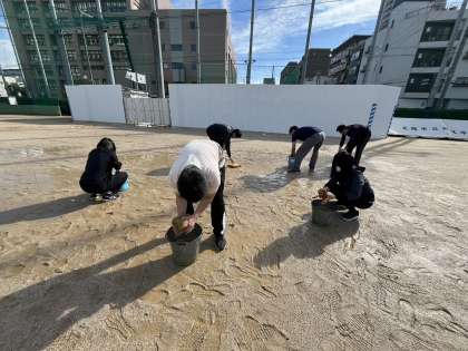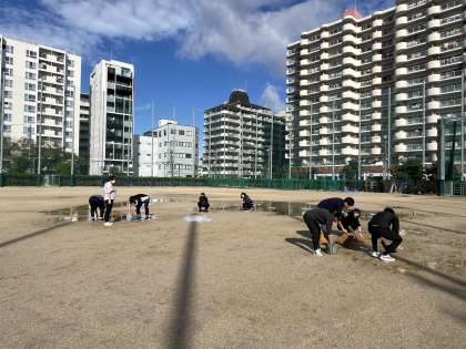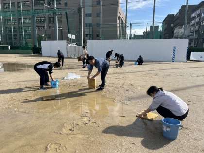 授業中ではありますが、手の空いている教員でグラウンドの水を吸い上げるなど、午後の体育大会準備に向けて作業を進めています。