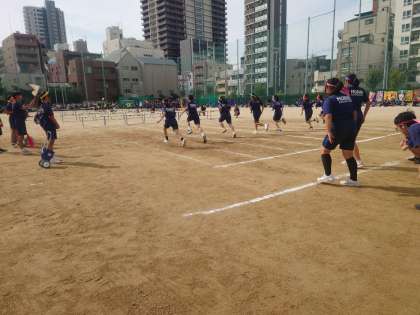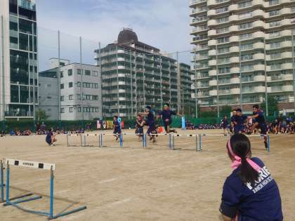 プログラム6番の50mハードル走です。さすが3年生見事なハードリングでゴールしました。