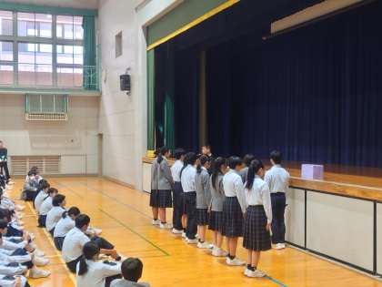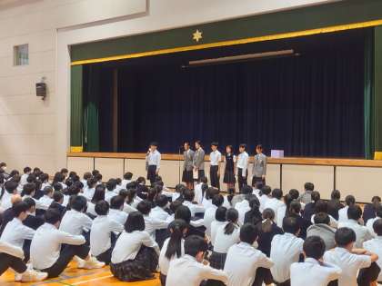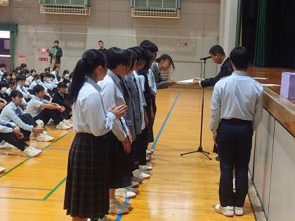 後期生徒会役員と後期生徒委員会の認証式が行われ、認証状が手渡されるとともに、新旧の生徒会長よりあいさつが行われました。