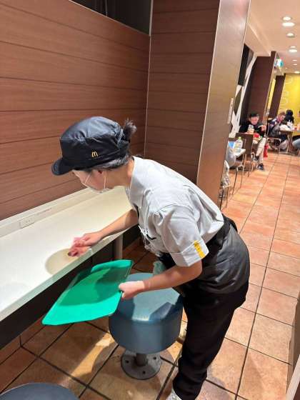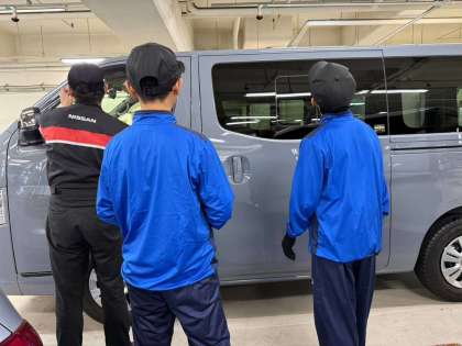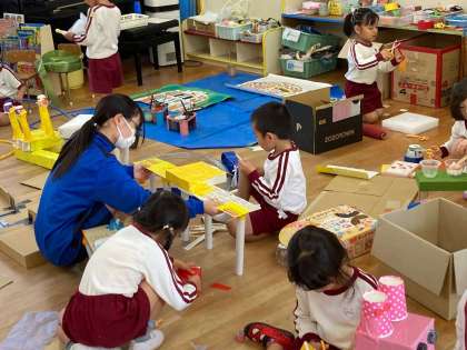 自動車会社で説明を受けています。幼稚園では一緒に工作を、ハンバーガーショップでは、キレイに机の清掃をしています。