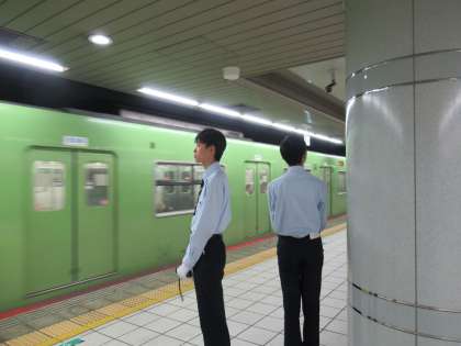 JR難波駅でも体験を行わせていただきました。終点なので、到着した電車内の点検も行いました。