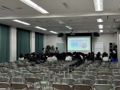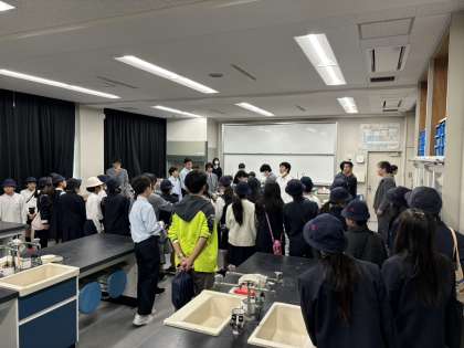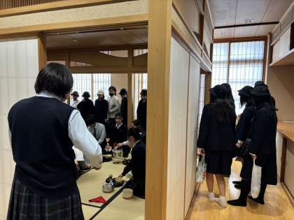 大会議室での学校紹介を聞き、各部活動をクラスごとに巡っています。