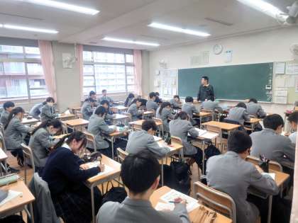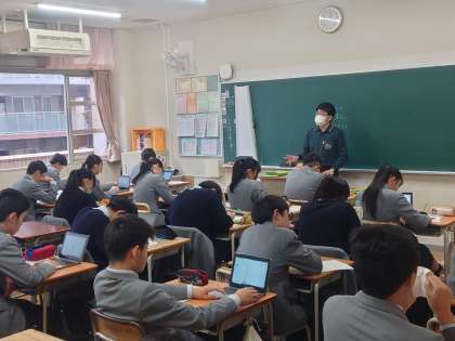 教室で行われた、学習用端末を活用しての自己申告書作成と、卒業文集の下書きを行っている様子です。
