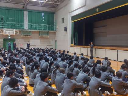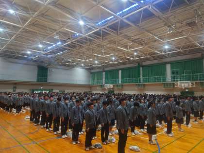 令和7年がスタートしました。新年が始まり、たいへん寒い日が続いています。そんな中ですが、堀江中学校の生徒たちの、大きなあいさつ声が体育館に響き渡りました。
