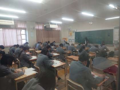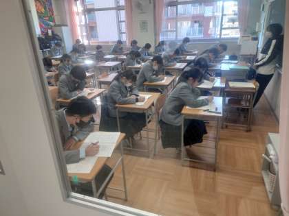 3年生は昨日に引き続き第5回目の実力テストに取り組んでいます。2限目の英語のテストが行なわれています。リスニングに真剣に耳を傾けている様子が伺えます。
