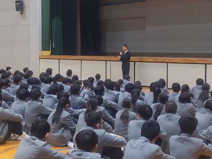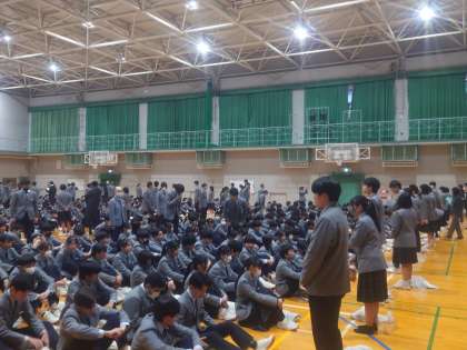 8時20分ごろの様子です。生徒会役員、委員長、体育委員が中心となって、集会の呼びかけを行っています。協力して全校集会を早くスタートする取り組みが行われています。
