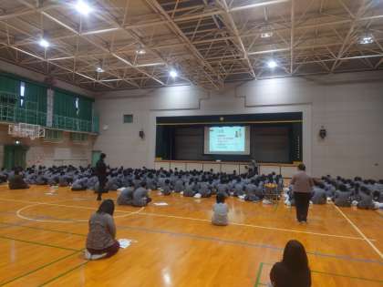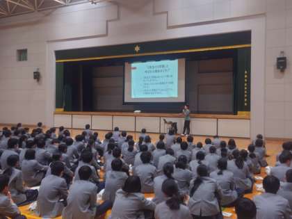 3年生がまさに今進路選択に向けて動いている真っ只中。そんな時期に合わせて、2年生は進路学習を体育館で行いました。
