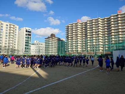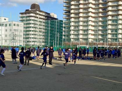 生徒たち、先生たちの応援の声がグラウンド中に響き渡っています。いつものことですが、行事には一生懸命、全力で取り組む堀江中学校の生徒たちです。自分たちで行事を成功させようという思いが感じられます。女子のレースに続いて男子のレースが行われました。