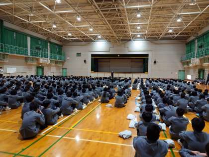 今日はいつもとは違います。3年生は本日私学入試日のために集会にいないからです。しかし、2つの学年であっても大きな声でのあいさつが響きました。