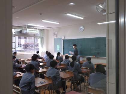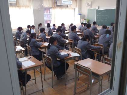 3限目の数学のテストの様子です。机の中に物が入っていないことを確認し、テスト用紙が配布されています。静かな状況の中、集中している表情が見受けられます。