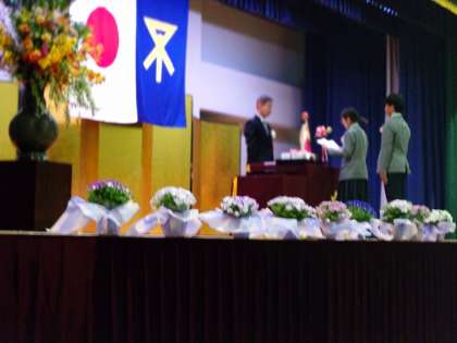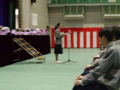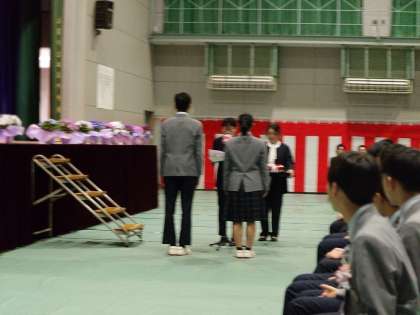 校長先生より式辞、PTA会長からは祝辞をいただき、記念品がPTAの方から代表生徒に送られました。