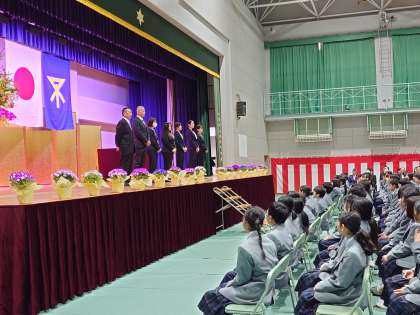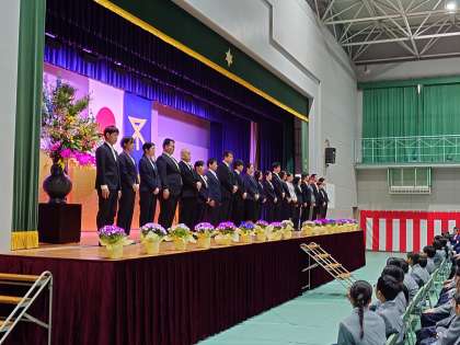 1学年に関わる先生、職員の紹介です。壇上の端から端までの人数となるので、新入生にとってはなかなか顔と名前が一致しないかもしれませんが、少しずつ覚えていってください。