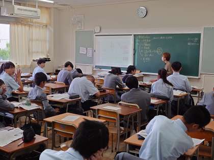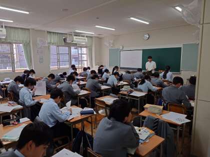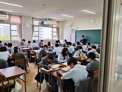 写真は、1限目に行われた各学年の授業の様子です。グループワーク、プロジェクターを使って視覚に訴えかける授業等が行われています。真剣に取り組んでいる様子が見受けられます。