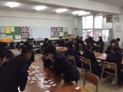 2月6日(土)の土曜授業で行われる「かるた大会」に向けて、1・2年生で練習が始まりました。今日も、各クラスからメンバーが混ざり合って、それぞれの指定された教室で練習をしました。上の句で札をとれる人も増えてきました。どのグループも本当に楽しそうに、読み手の先生の声に聞き耳をたてながら練習をしていました。1回目より2回目、2回目より3回目の練習しながら、それぞれが取れる札を増やしていきましょう。かるたキング・かるたクイーンめざして!!