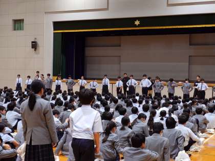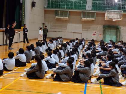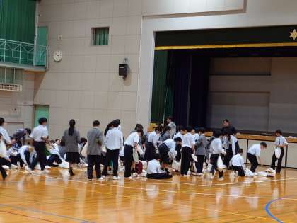 6限目の体育館での取り組みも、時間通りの開始ができず、再スタートとなりました。2度目の集合は、無駄な話し声は聞こえず、「横もそろえて」「靴もまっすぐ置いて」といった委員長の声かけだけが体育館に聞こえています。