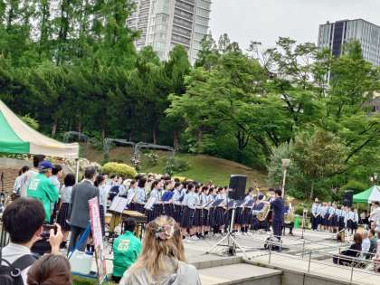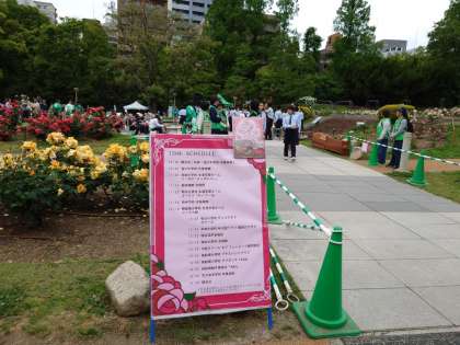 天候が危ぶまれていましたが、明け方には雨もあがり毎年恒例の「バラ園コンサート」が開催されました。開催場所の靭公園が完成して70周年記念の開催となっています。