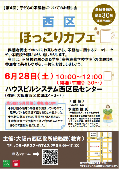 令和7年6月28日(土)午前10時からハウスビルシステム西区民センターにて「第4回 西区ほっこりカフェ(子どもの不登校についてのワークショップ)」を開催します。