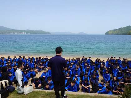京都府立青少年海洋センターに到着しました。砂浜に集合し、このあと昼食となります。