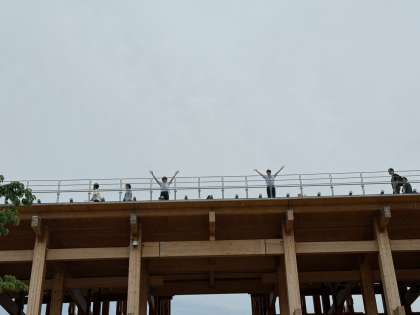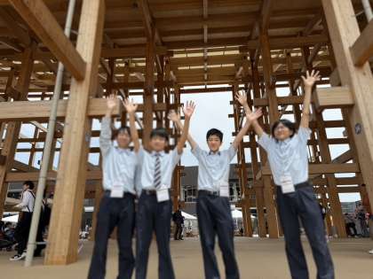 高さ12メートル、全周約2キロメートルの世界最大の木造建築物として、ギネス世界記録に認定された大屋根リングの様子です。